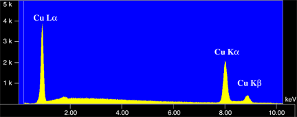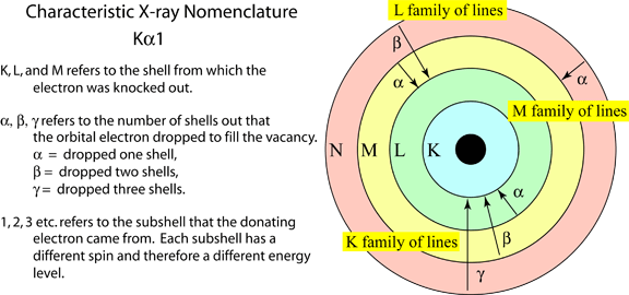 Below is an energy spectrum of the X-rays produced from copper. There are three characteristic X-rays, CuKa, CuKb, and CuLa. These multiple X-ray lines are produce because copper has a number of electron shells. Therefore each set of electron shells will produce X-rays of a different energy. Also below is a diagram outlining the nomenclature used for cataloging characteristic X-rays.