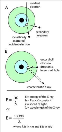 A characteristic X-ray forms when a beam electron interacts with an orbital electron in the sample. If the energy of the beam electron is high enough, the orbital electron can be ejected from its shell leaving a vacancy behind (A). A vacancy cannot last long in an electron shell, and an electron from one of the outer shells will drop in to fill this hole.