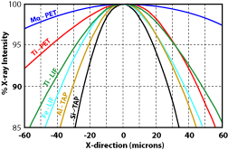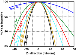 The same problem will occur when the beam is off of the cross-hairs as when the sample is out of optical focus. Specifically the spot generating the X-rays will not be aligned with the spectrometers. As a result there will be a drop in the number of measured X-rays (Fig. 2). This decrease will increase with distance from the cross hairs, and will vary with the X-ray line.