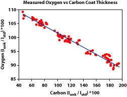 Non-conductive samples must be coated with a conductive surface before analyses. The coating is usually carbon, because it is a low atomic number element, and therefore will have less of an effect on the analyses. However, it is still important that the same thickness of carbon be used on both the standard and the unknown sample. Using too little or too much carbon can have a very large effect on light element analyses (Fig. 4). For these analyses, it is best to carbon coat the standard and unknown at the same time to ensure the same thickness is obtained.